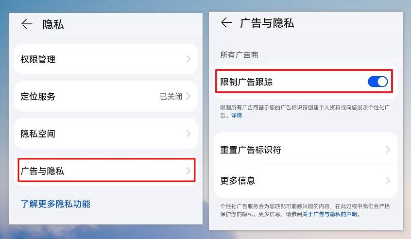 打开手机【设置】—【隐私】—【广告与隐私】,开启【限制广告跟踪】。开启之后虽然不能杜绝广告,但是可以限制所有的广告商基于我们的广告标识符创建个人资料或向我们展示个性化广告。