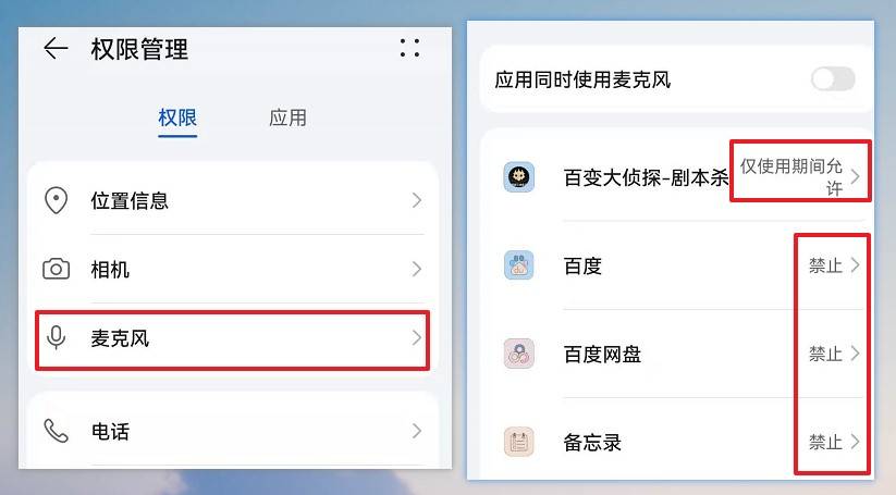 打开【设置】—【应用和服务】—【权限管理】—【权限】,点击【麦克风】,将不需要使用麦克风的应用,设置为【禁止】;而需要使用麦克风的应用则设置为【仅使用期间允许】。